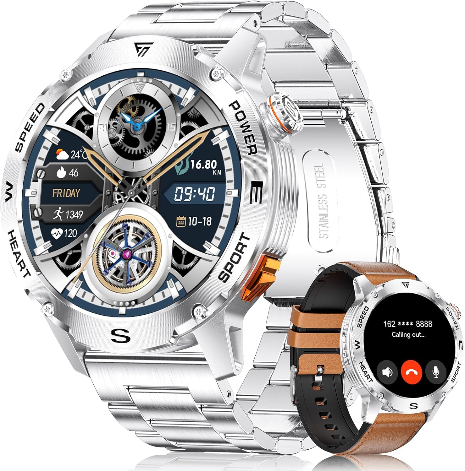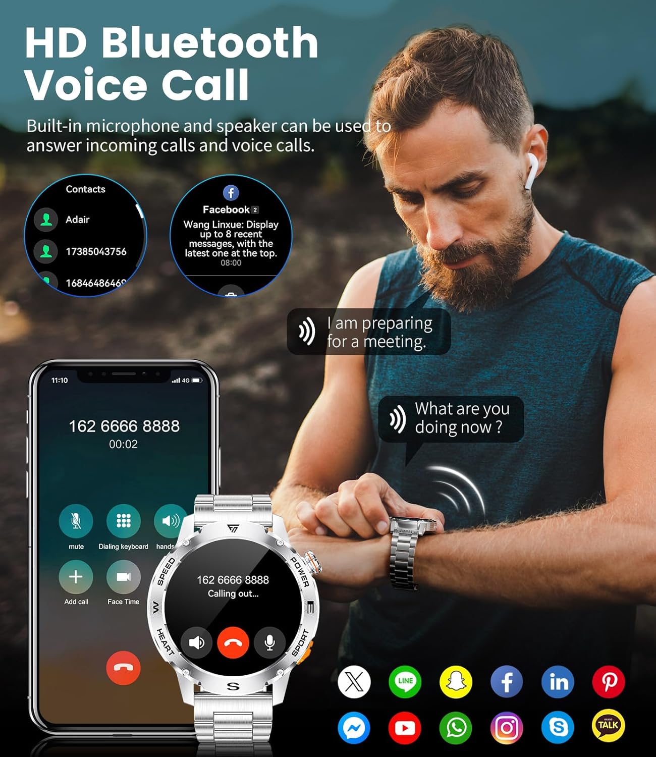 - 【460mAh High Capacity Battery And 5ATM Waterproof】This military smart watches for men uses corrosion-resistant 304 stainless steel case and band, and fully enclosed 5ATM waterproof design guarantee reliability in the face of extreme environments. With a sizable 460mAh battery, it offers an impressive 5-10 days of usage and an extended battery life of up to 30 days.